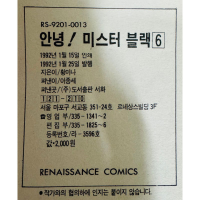 | 도서명 | 안녕 미스터 블랙 1~6 전6권 완질세트 / 황미나 / 서화 / 1991~2년 초판본 |
